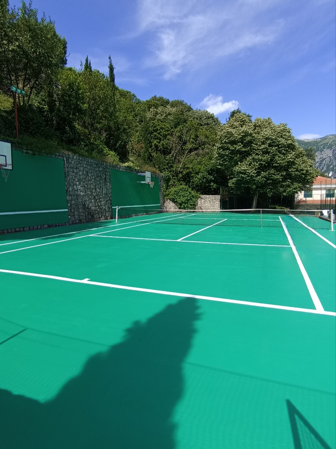 The residential complex has a swimming pool with a view, a tennis court, and a beautiful, well-kept garden. Parking
